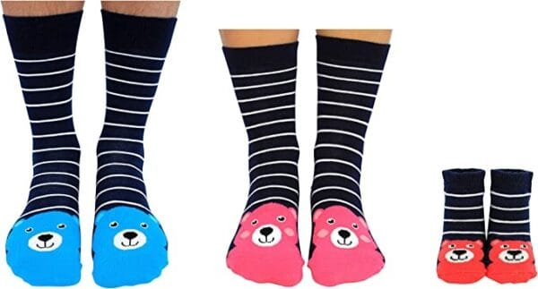 Zábavný dárek pro miminko, tatínka a maminku – dárková krabička s ponožkami pro všechny tři! Jeden pár ponožek pro dospělé 40-46, jeden pár ponožek pro dospělé 37-42 let a jeden pár dětských ponožek pro miminko (novorozenec+).